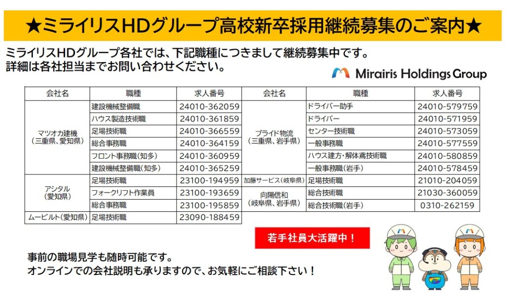 2025年09月24日(水)お知らせ 【ミライリスHDグループ】2026年高校卒採用継続のお知らせ ミライリスHDグループ各社では、2026年3月高校卒業予定の採用を継続募集しています。詳しくは各社求人票の採用担当までお問い合わせください。