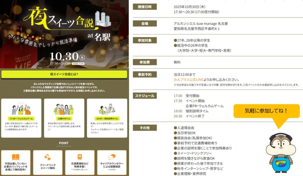 2025年10月20日(月)イベント 10月30日(木)夜スイーツ合説at名駅を開催! おしゃれなウェディング会場でおいしいスイーツを食べながら、 リラックスした雰囲気で企業と話ができる大人気の就活イベントです。 三重県企業に興味のある方なら誰でも参加OKですので、お気軽にお申し込みください。