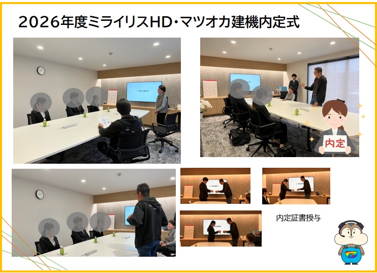 2025年10月27日(月)お知らせ 2026年度内定式を行いました! 10月25日(土)、2026年度の新卒社員 内定式を行いました。ミライリスグループでは、高卒採用がメインとなりますので、高校生も合わせての内定式は3月に予定しています。