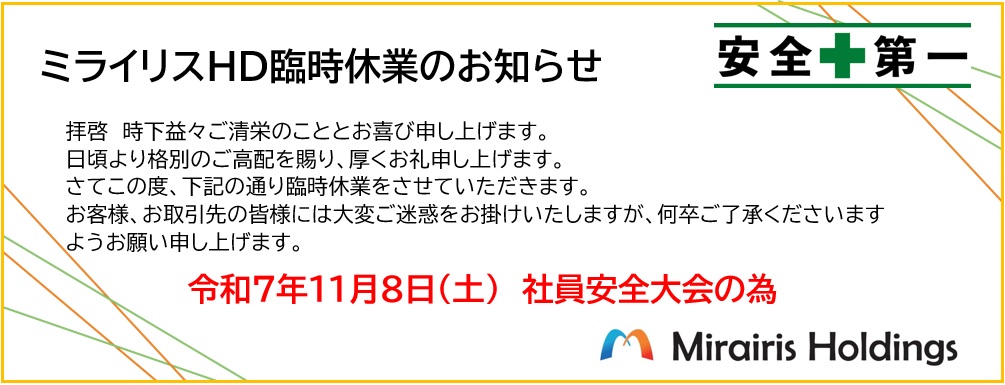 11月8日(土)は、令和7年度社員安全大会のため、臨時休業させていただきますので、何卒ご了承くださいますようお願い申し上げます。