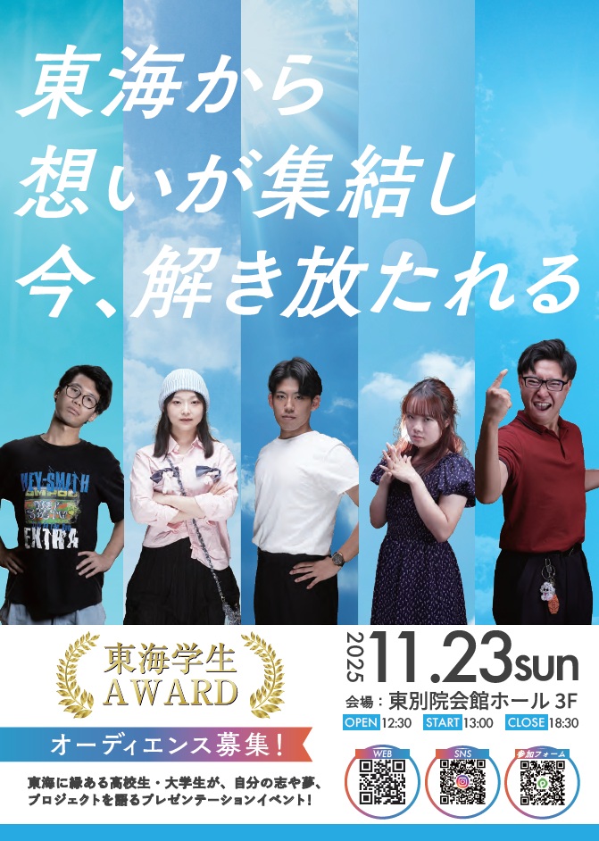 2025年11月17日(月)お知らせ 2025年11月23日(日)に開催の東海学生AWARDに協賛しています! 東海学生AWARDは、東海の未来を担う若者たちを【オフからオン】にするためのイベントです。自分の「確信・革新・核心」に全力で向き合い、思いを形にするため、プレゼンターたちは、この2ヶ月半のプログラムの中で合宿やブラッシュアップ会を通じて試行錯誤を重ねてきました。ぜひ応援に来てください!