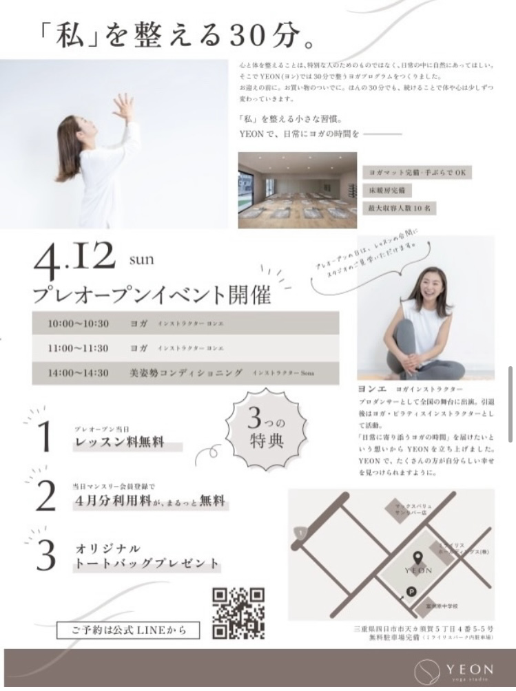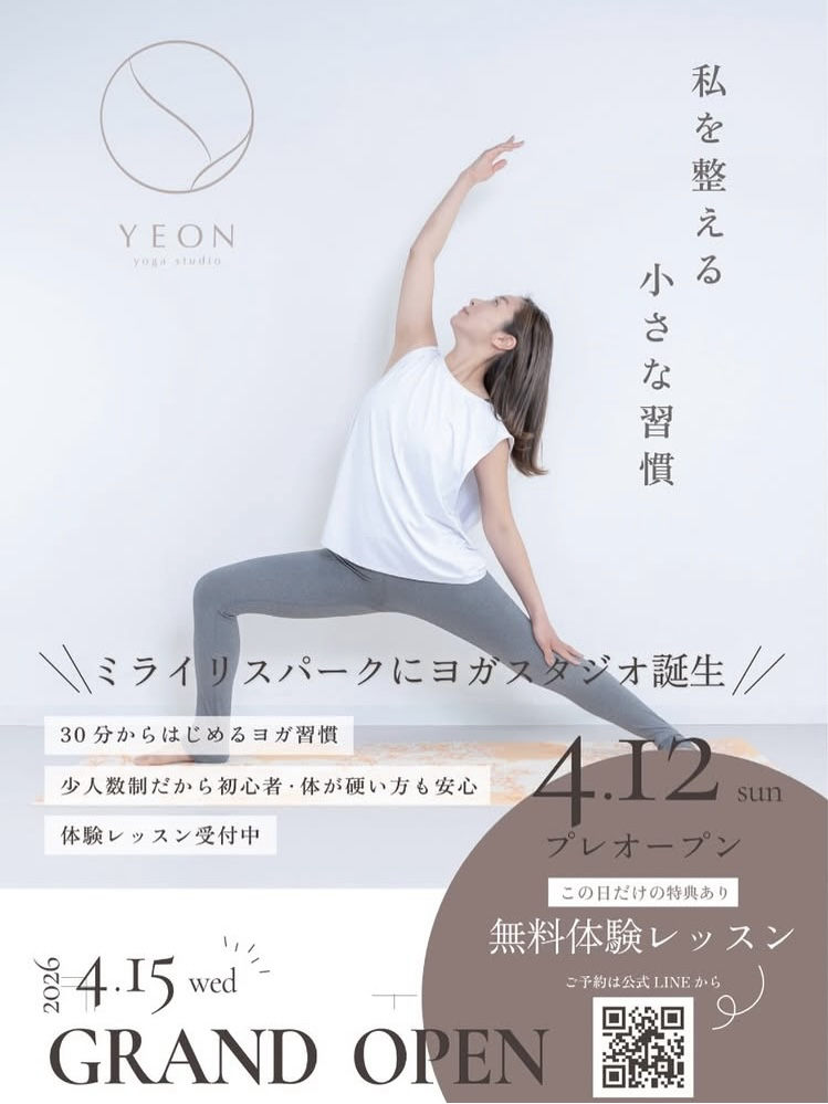 ミライリスパークに、ヨガスタジオ「YEON(ヨン)様」が4月15日にグランドオープンいたします。